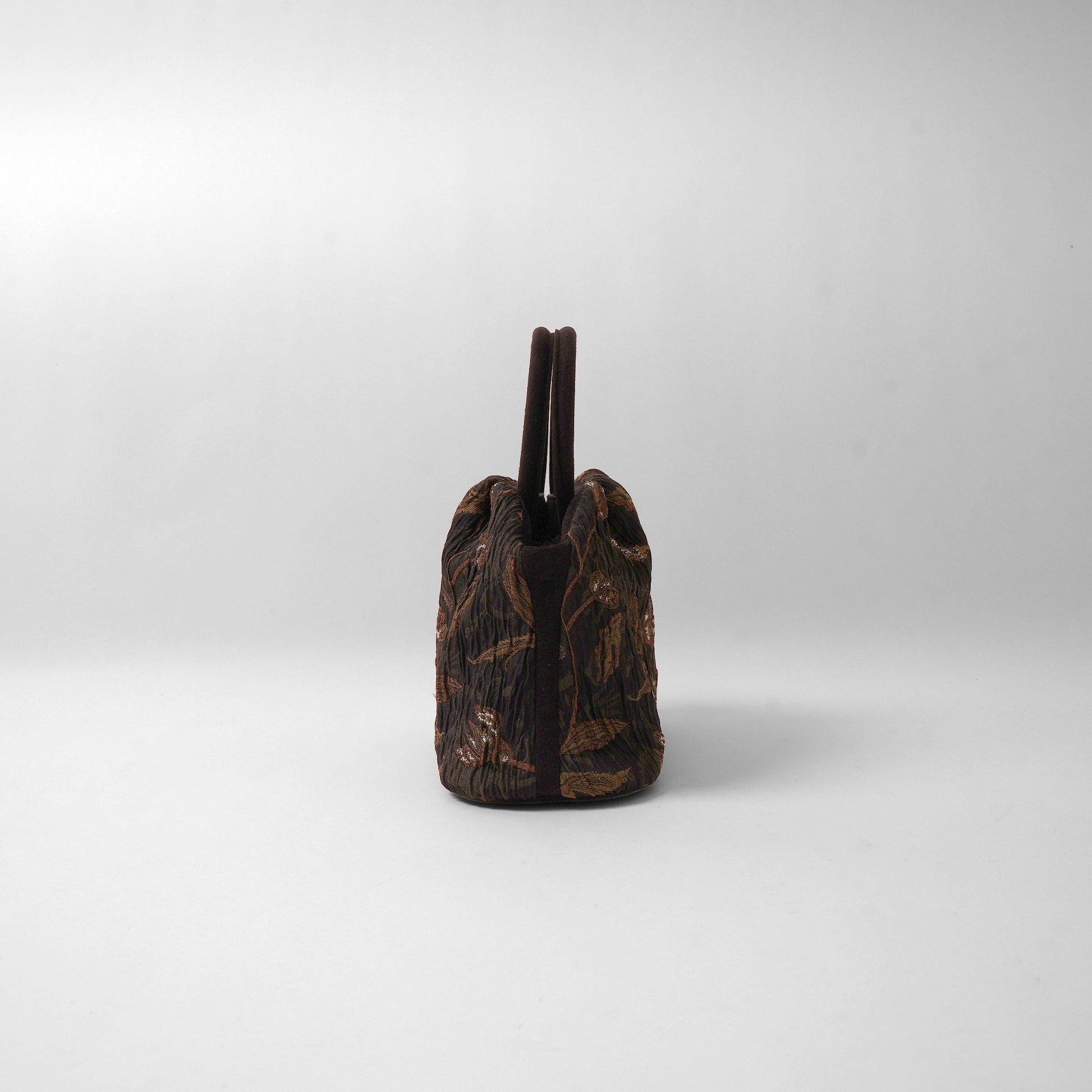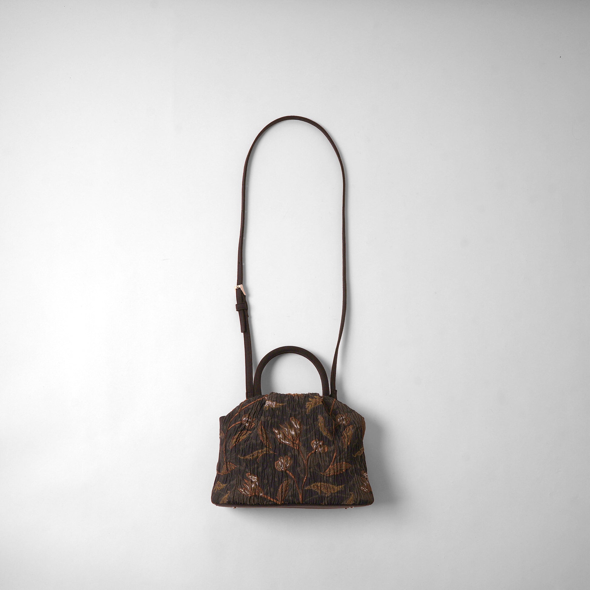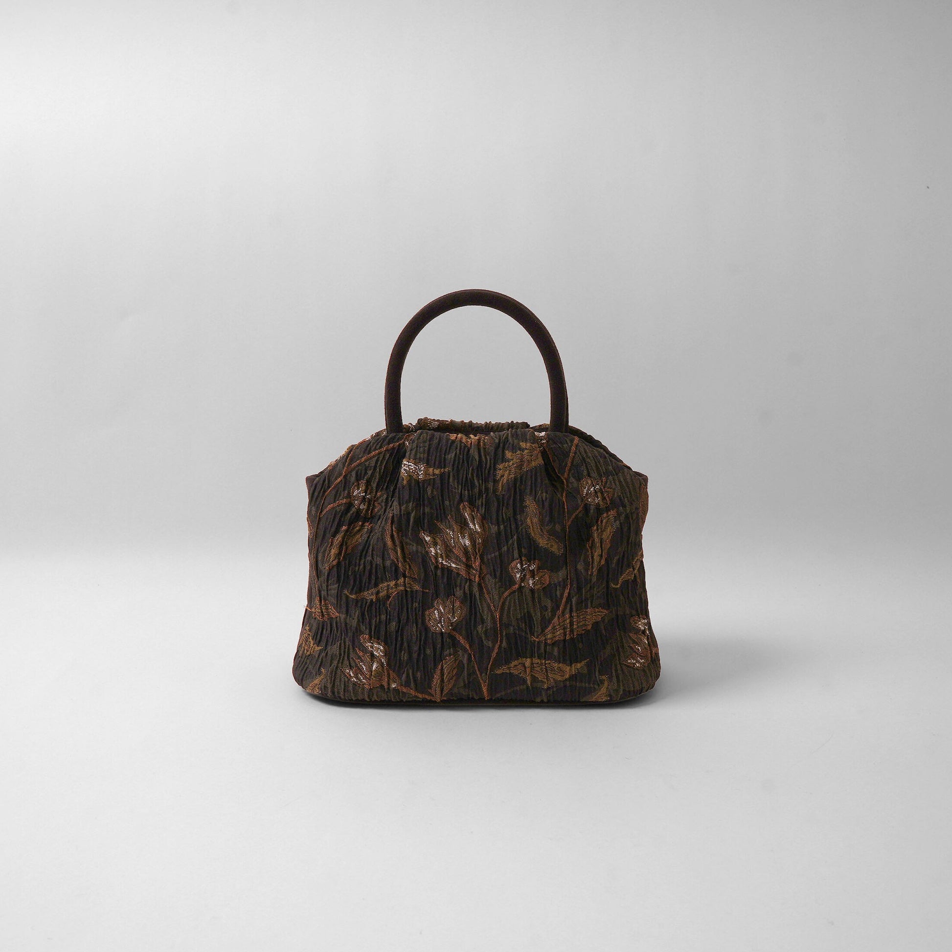 A jacquard fabric characterized by its nuanced texture and random ribs. Using six types of yarn—including lustrous yarn, warm-toned yarn, and matte yarn—it creates a rich, textured depth. The motif was drawn by layering intricate patterns while recalling the designer's own memories, subtly incorporating cyclamen, fallen leaves, vine patterns, and horses. Textiles where shadows and textures intertwine.