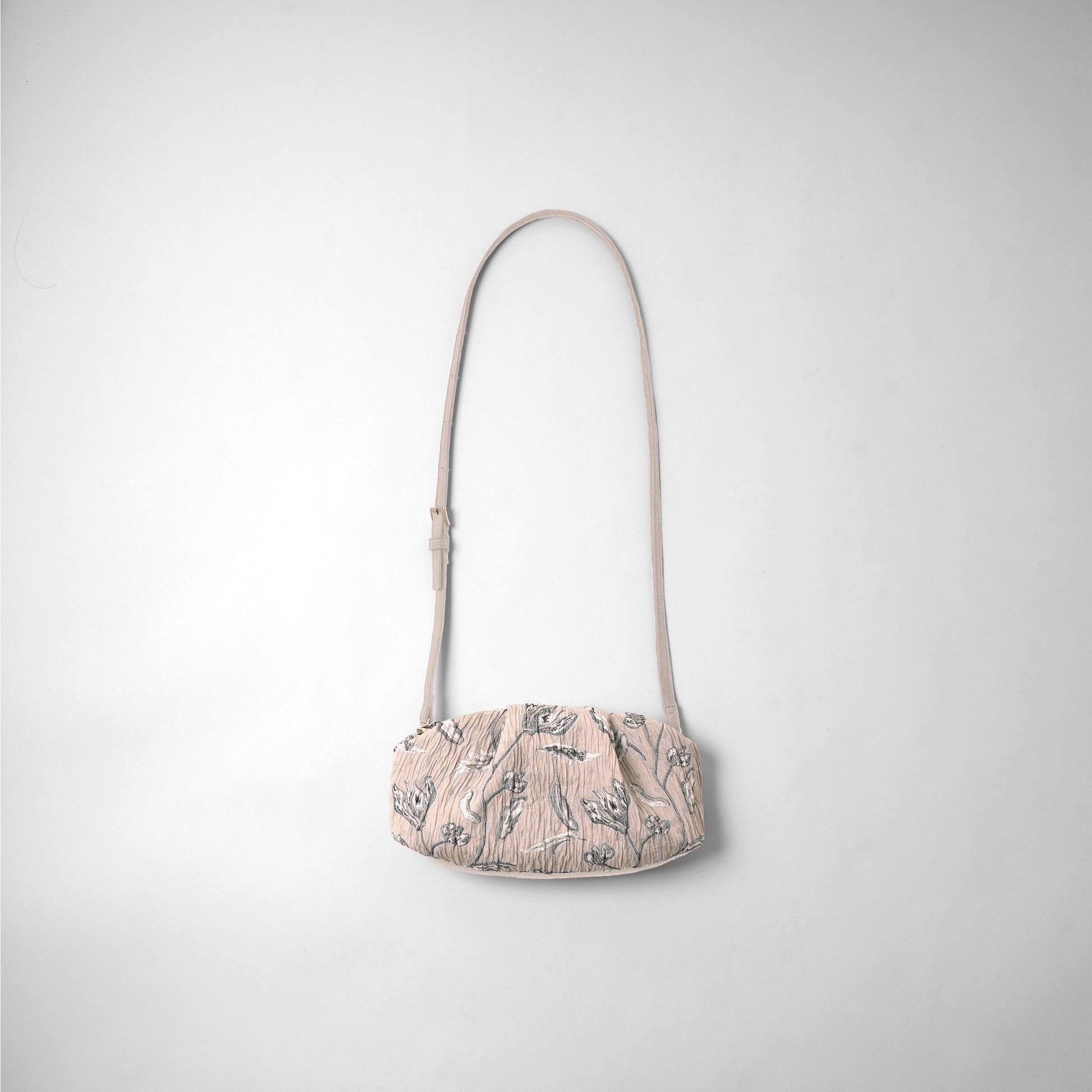 ・A clutch bag featuring a tuck design inspired by the “Fukura Suzume” obi knot style for furisode kimono